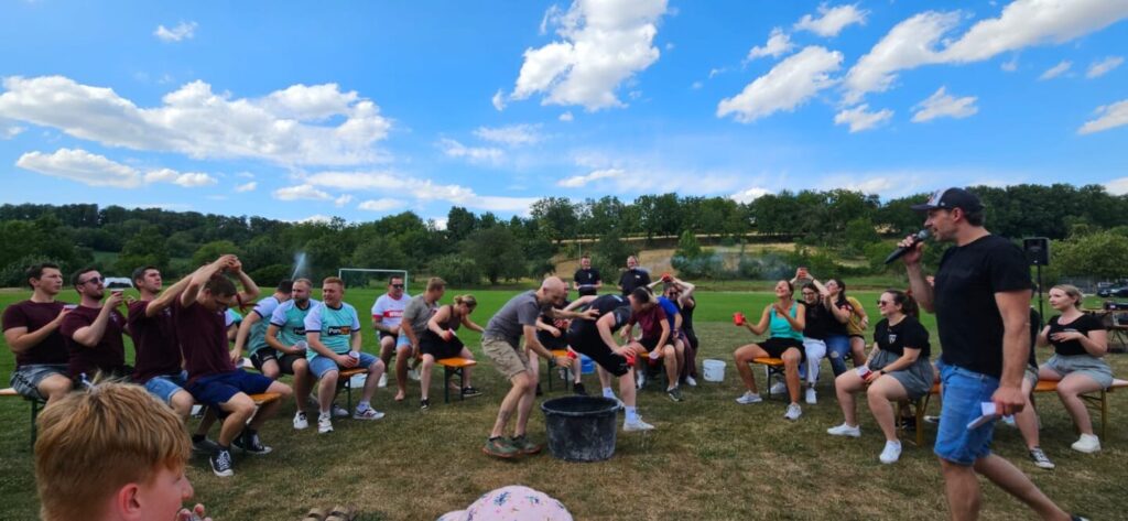 Spielfest austoben durften, nachdem es zuvor bereits ein Kinderschminken und Glitzertattoos gab. Highlight war dann einmal mehr die Gaudi-Olympiade mit sieben Mannschaften, die sich einen harten Kampf bei fünf abwechslungsreichen Spielen lieferten und das Publikum bestens unterhielten. Schließlich klang ein gut besuchtes Sportfest bei bestem Sommerwetter harmonisch aus.